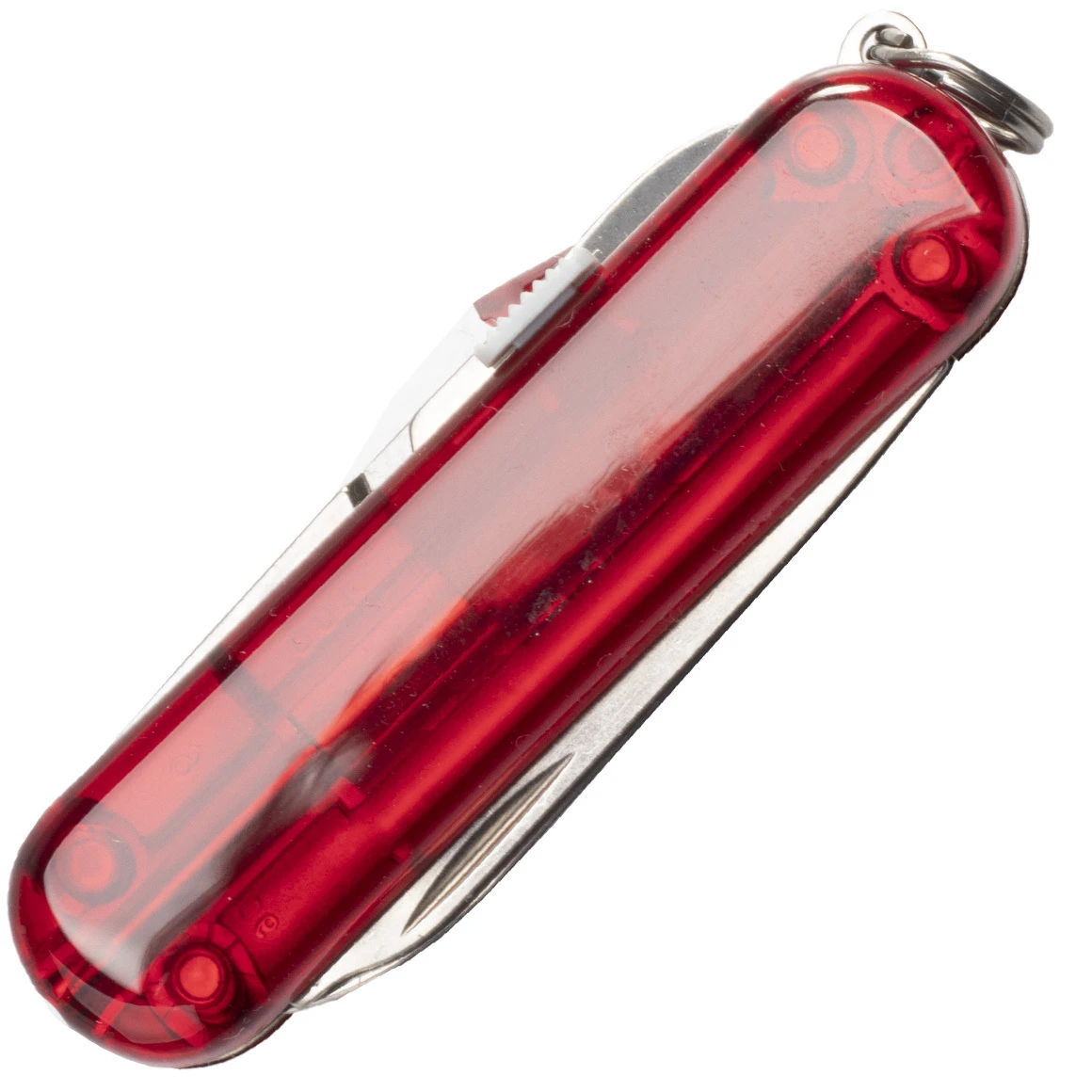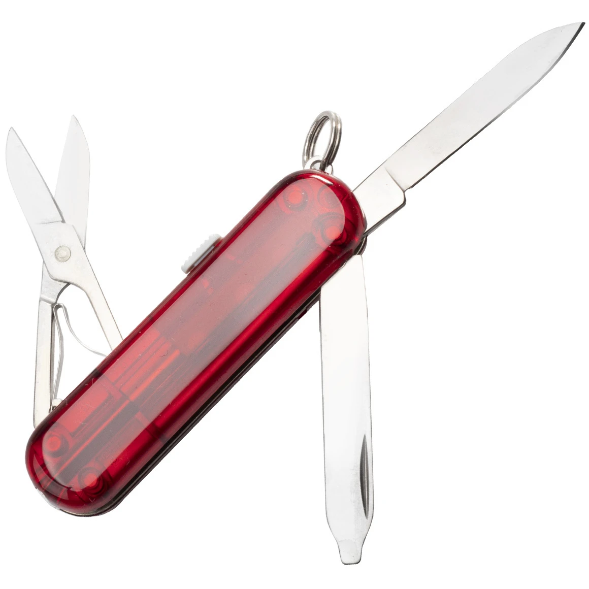 Kleines Taschenmesser Victorinox Signature LITE Rot transparent, LED enthält neben den klassischen Funktionen von Schweizer Multifunktionsmessern einen Kugelschreiber und ein LED-Licht zur Orientierung im Dunkeln.