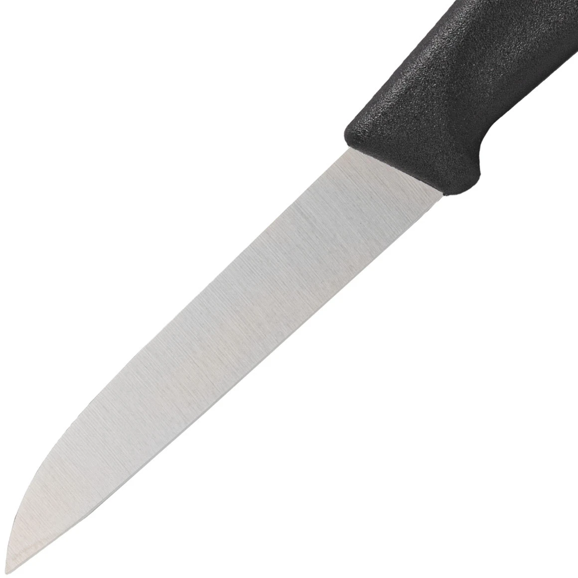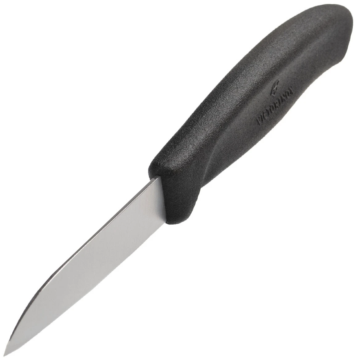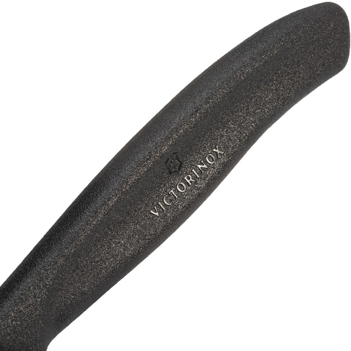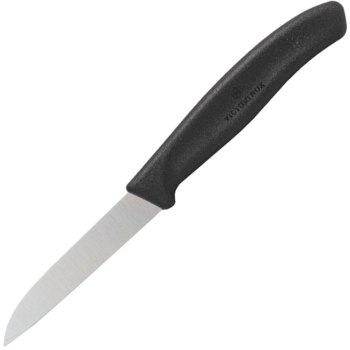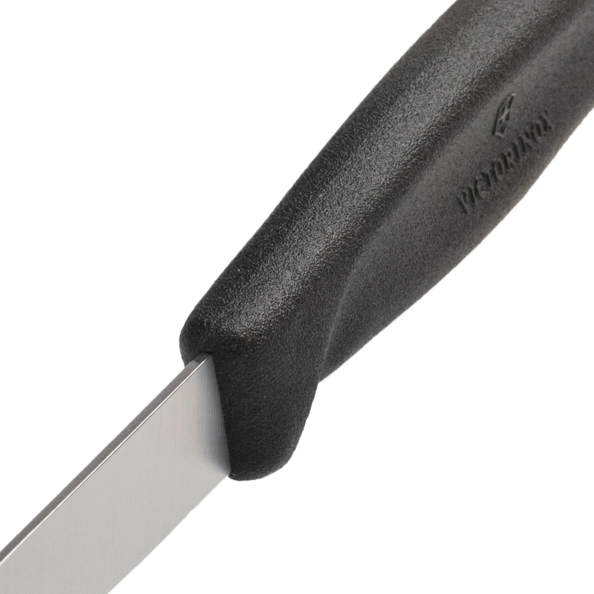 Das Küchenmesser Victorinox Swiss Classic Gemüsemesser mit fester Klinge mit glatter Kante und einer Länge von 8 cm zum Schneiden von Obst und Gemüse. Der Griff besteht aus schwarzem Polypropylen.