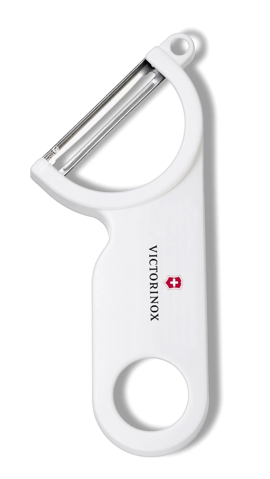 Gebogener Victorinox-Kartoffelschäler mit weißem Kunststoffgriff.